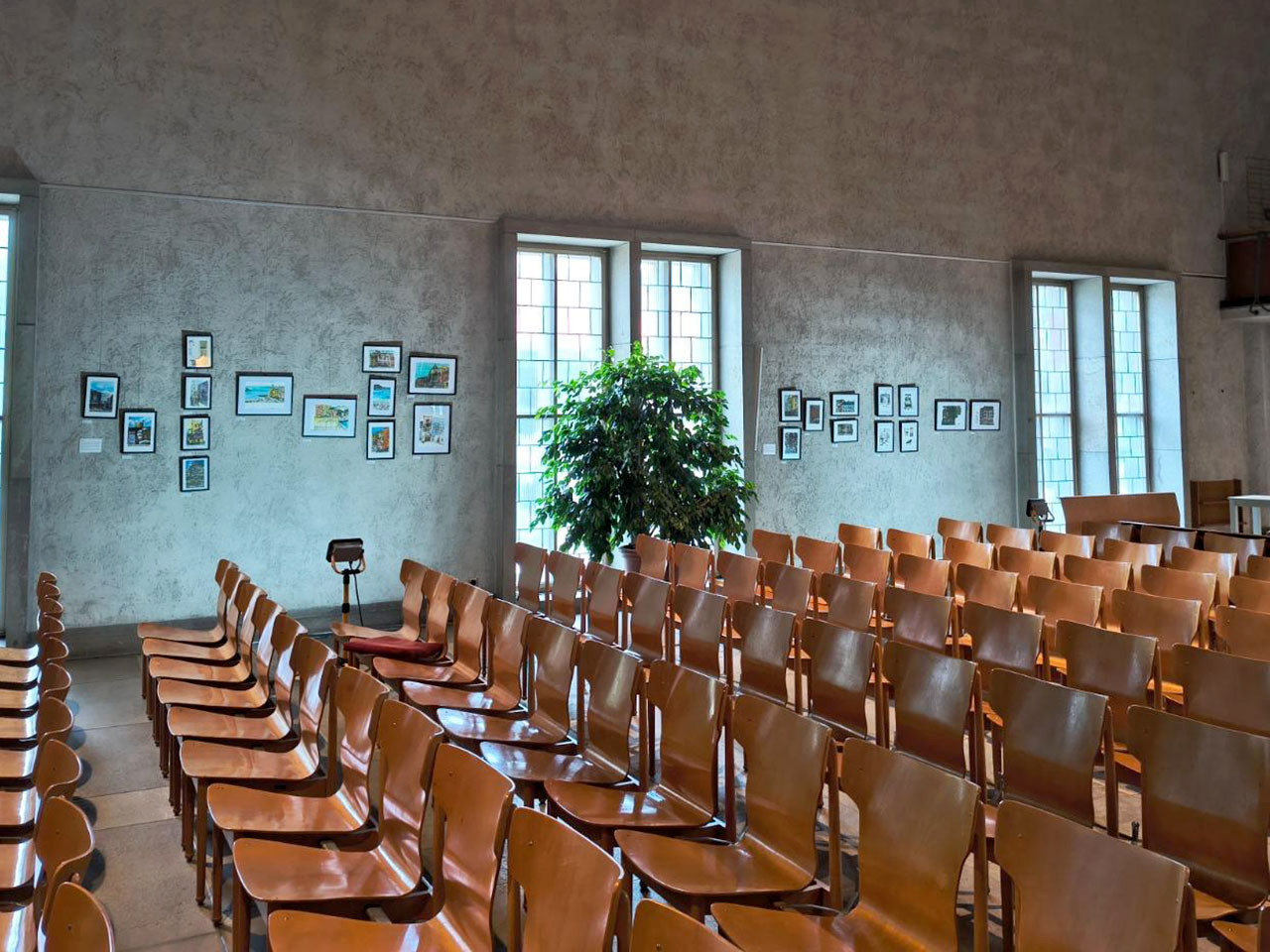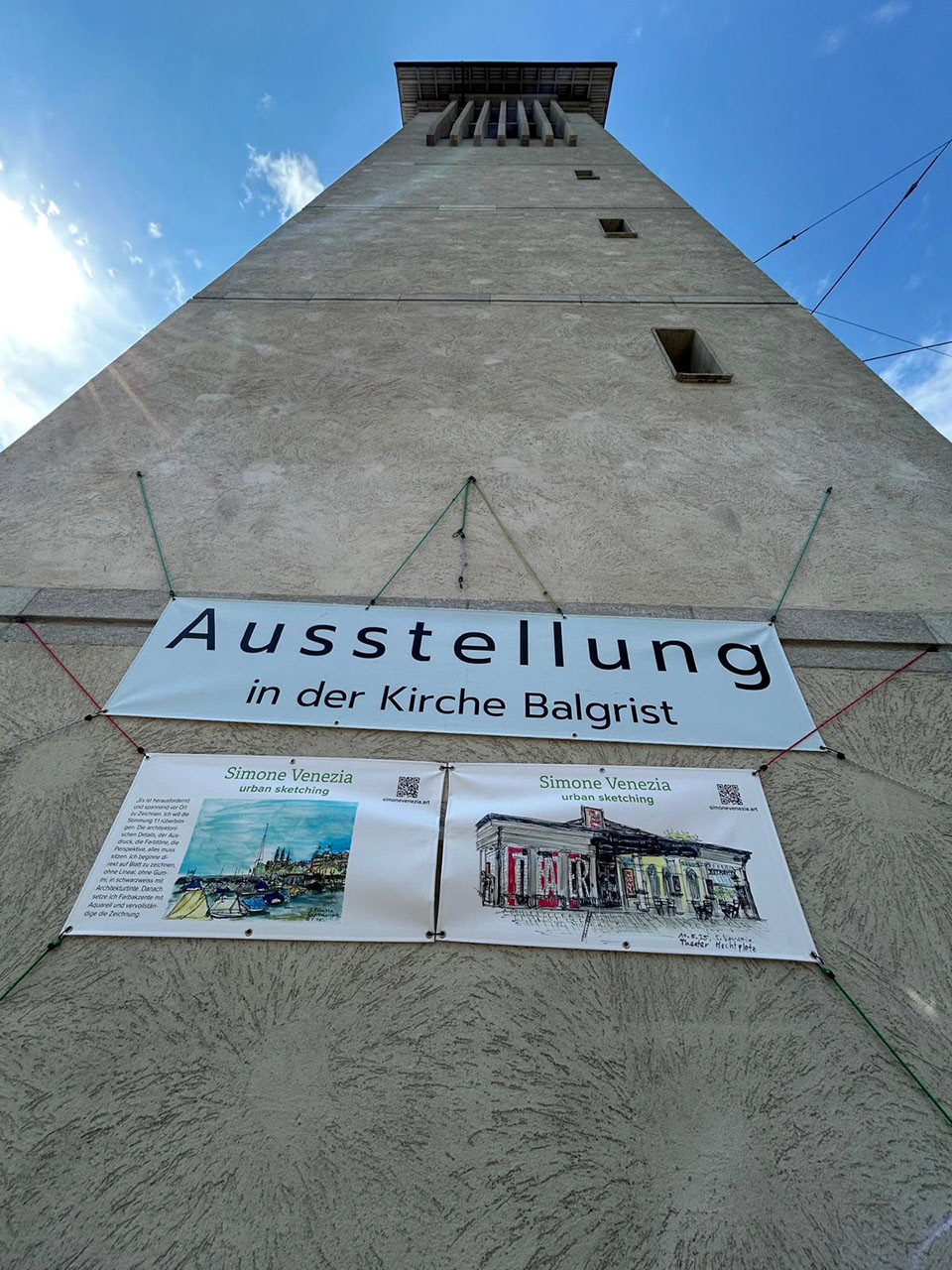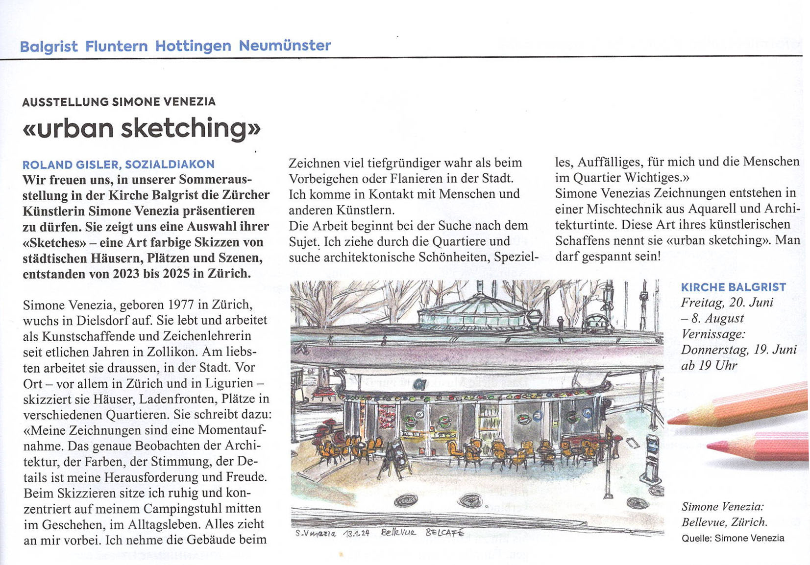 simone venezia, "urban sketching – zeichnungen stadt zürich 2023–2025", in der kirche balgrist, vom Freitag, 20. Juni bis 8. August