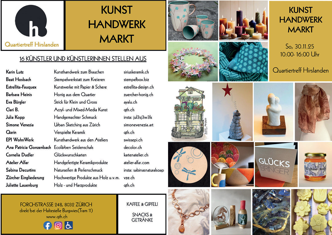 kunsthandwerkmarkt im Quartiertreff Hirslanden, Sonntag, 30. November von 10.00 bis 16.00 Uhr